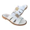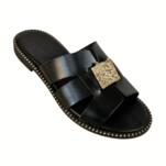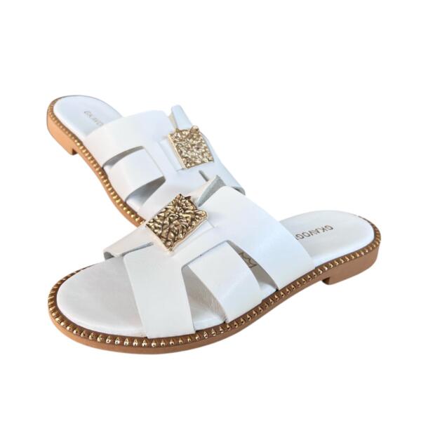 Leather sandals with faux leather and toe embellished with gold plated metallic decorations