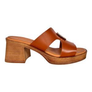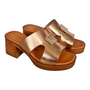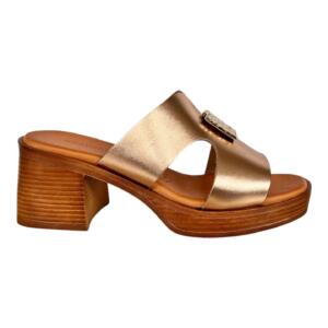 Leather sandals with wide heel with openings trimmed with gold plated metallic decorations