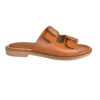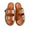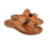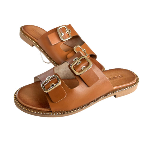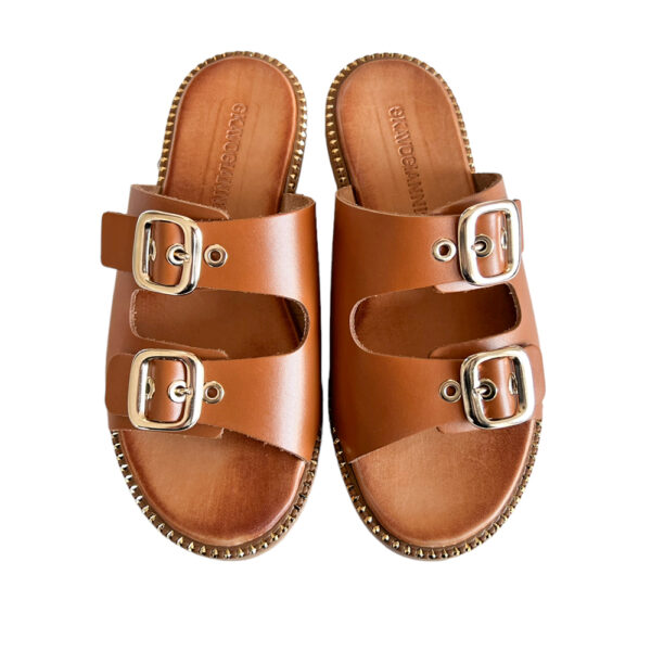 Leather sandals with wide heel with openings trimmed with gold plated metallic decorations
