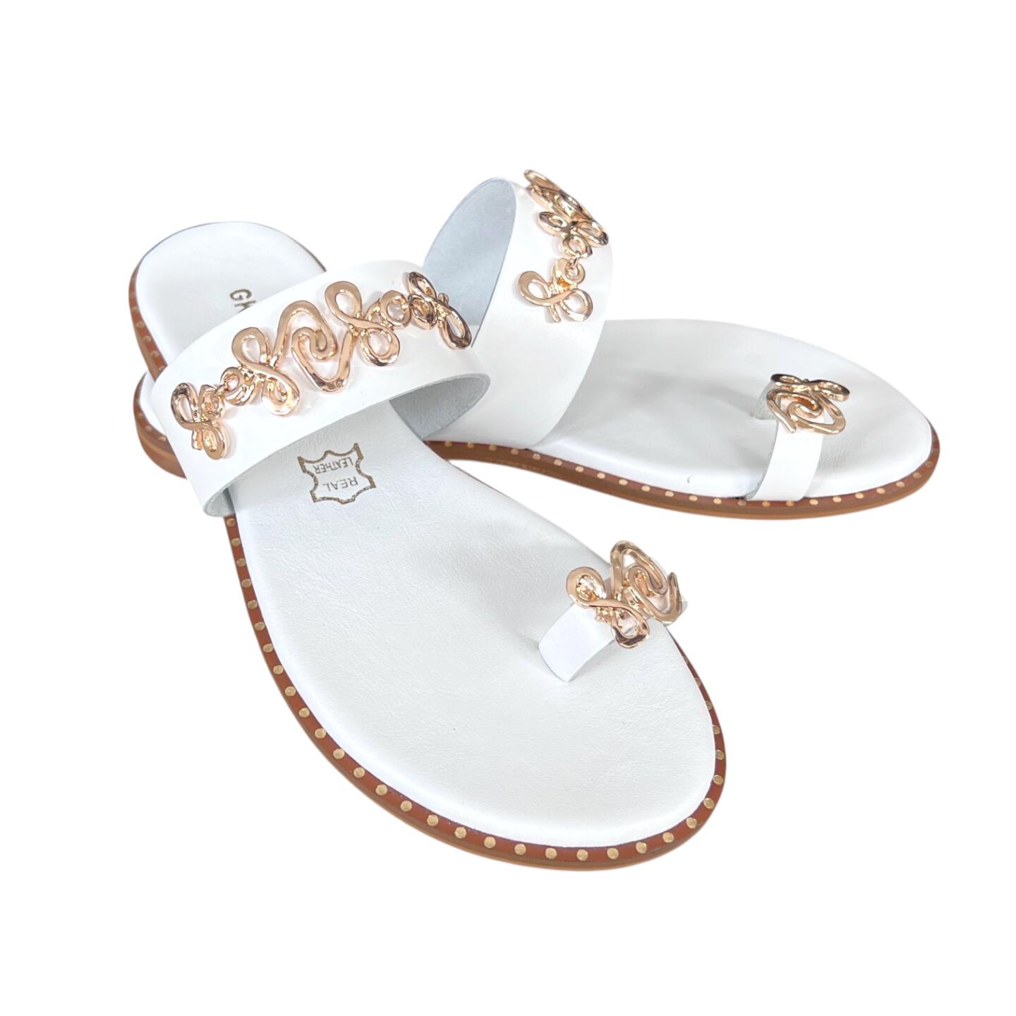 Leather sandals with wide heel with openings trimmed with gold plated metallic decorations