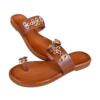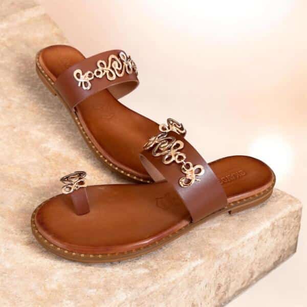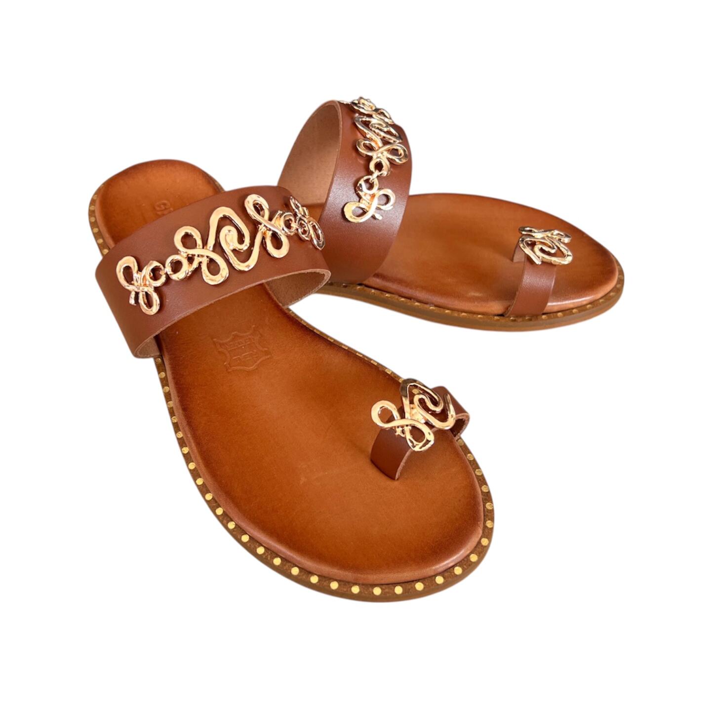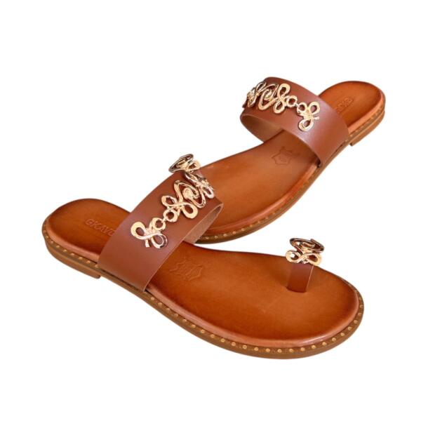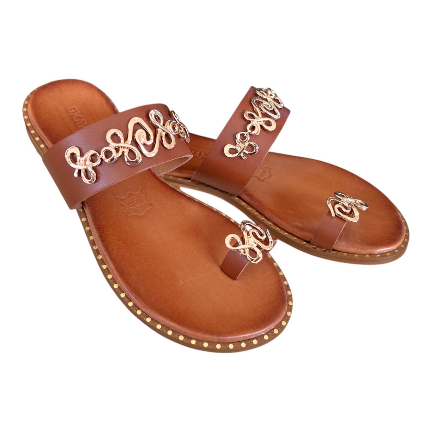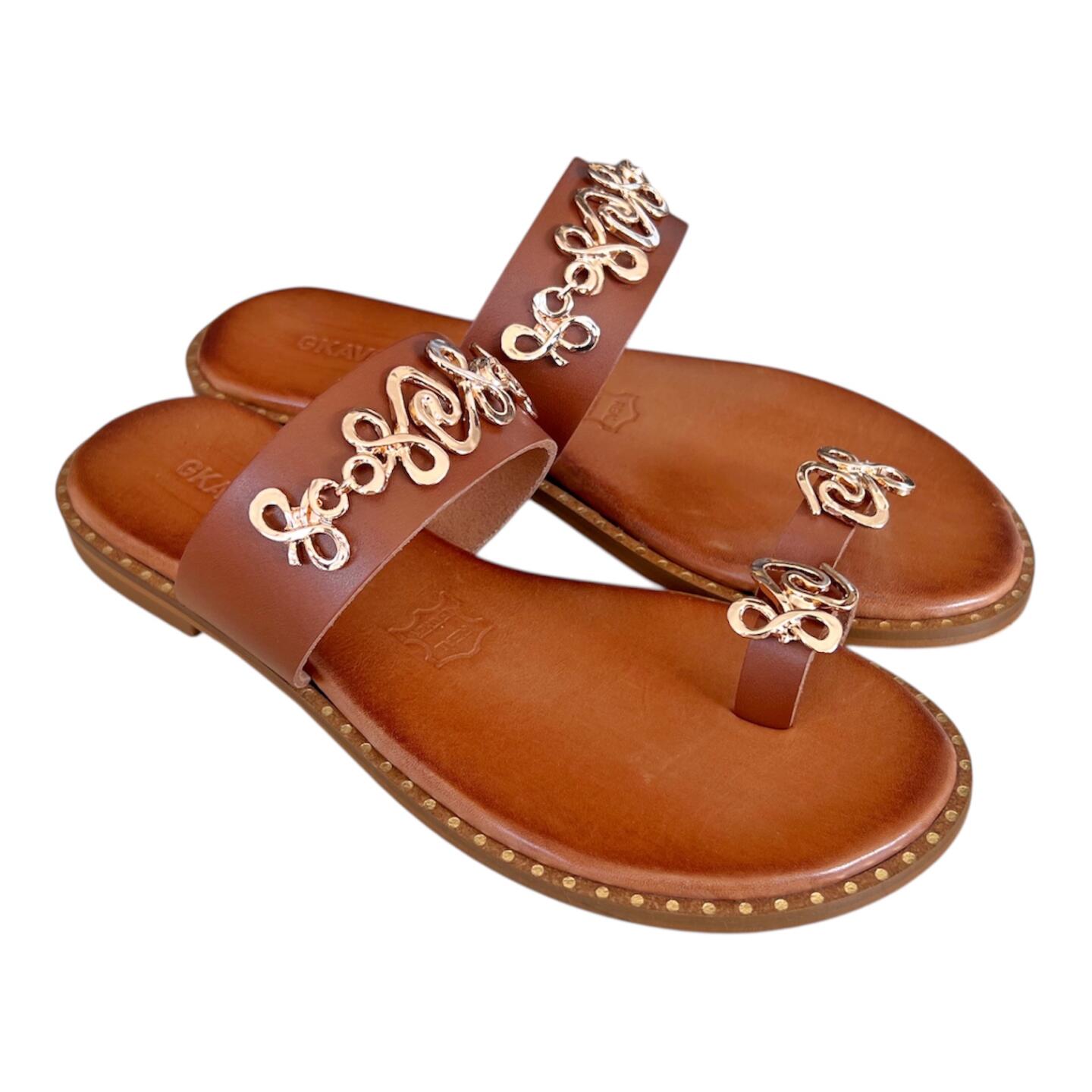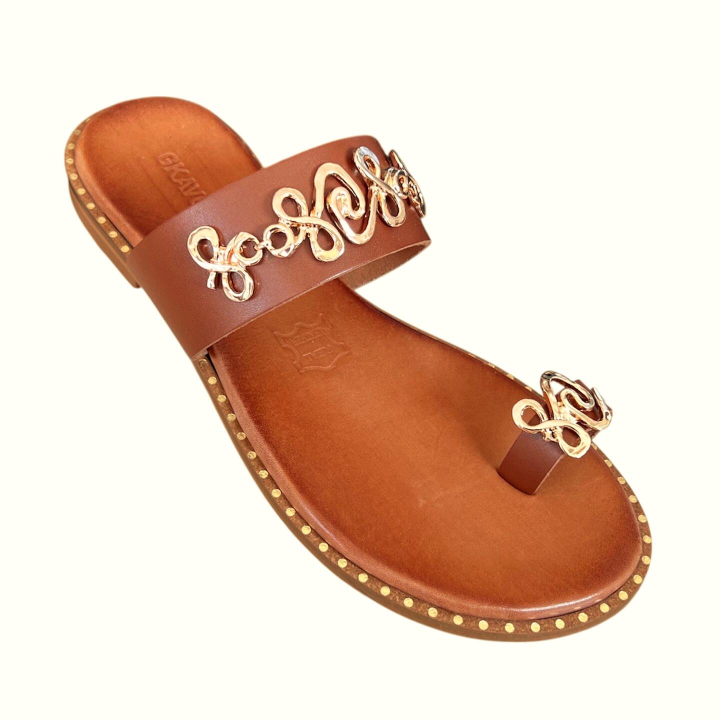Το flat δερμάτινο σανδάλι GKAVOGIANNIS με επίχρυσα διακοσμητικά στοιχεία εκφράζει τη σύγχρονη ελληνική κομψότητα μέσα από καθαρές γραμμές και διακριτική λάμψη.