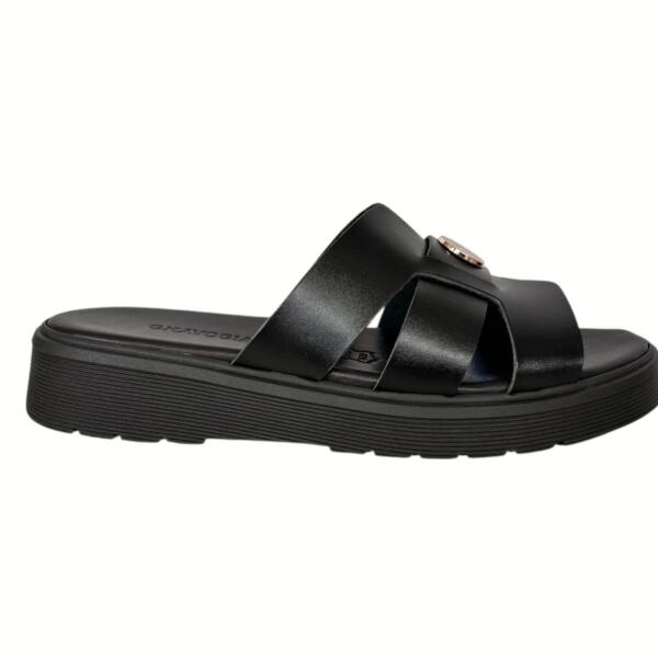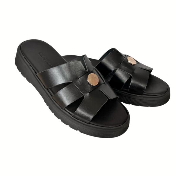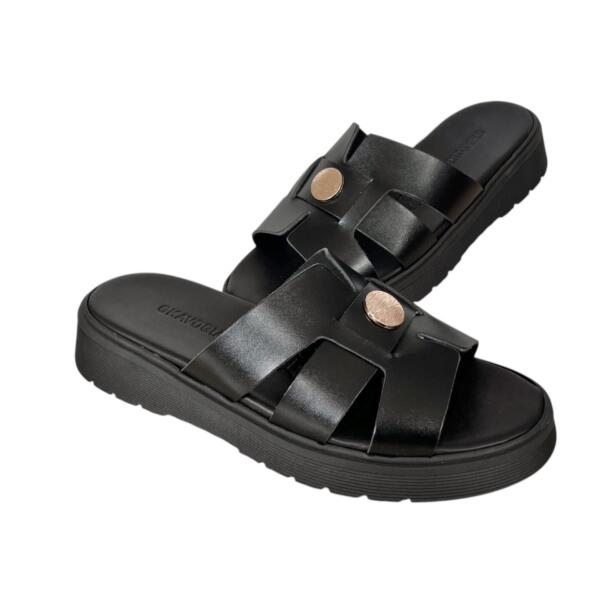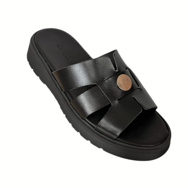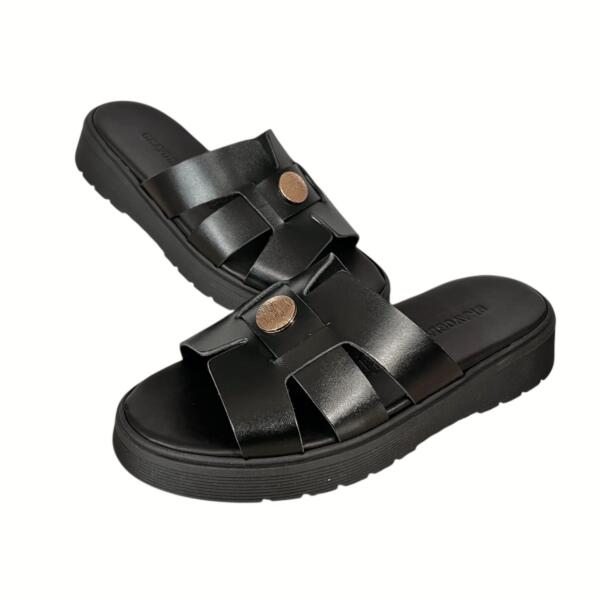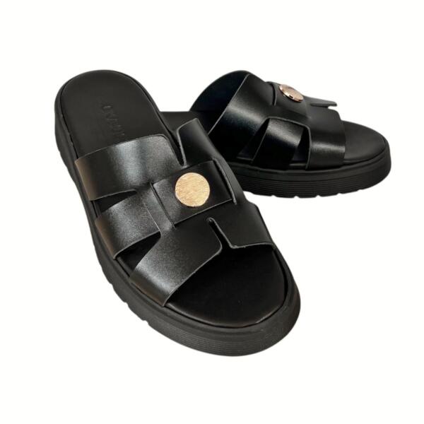 It has a non-slip sole with a print around the perimeter, the bottom is leather with a soft cushion for comfortable footing and the shape is regular.