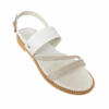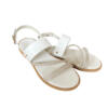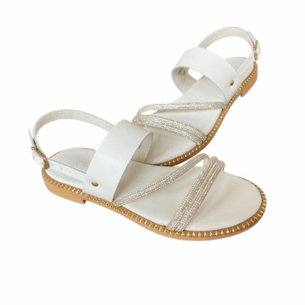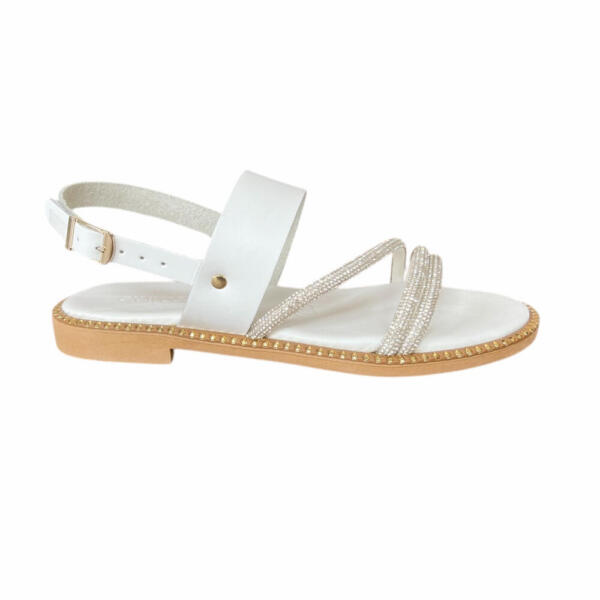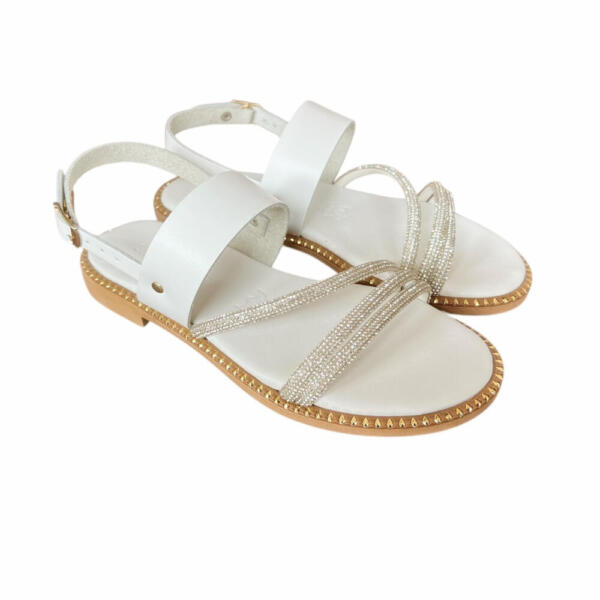 Leather sandals with wide heel with openings decorated with gold plated metallic decorations.