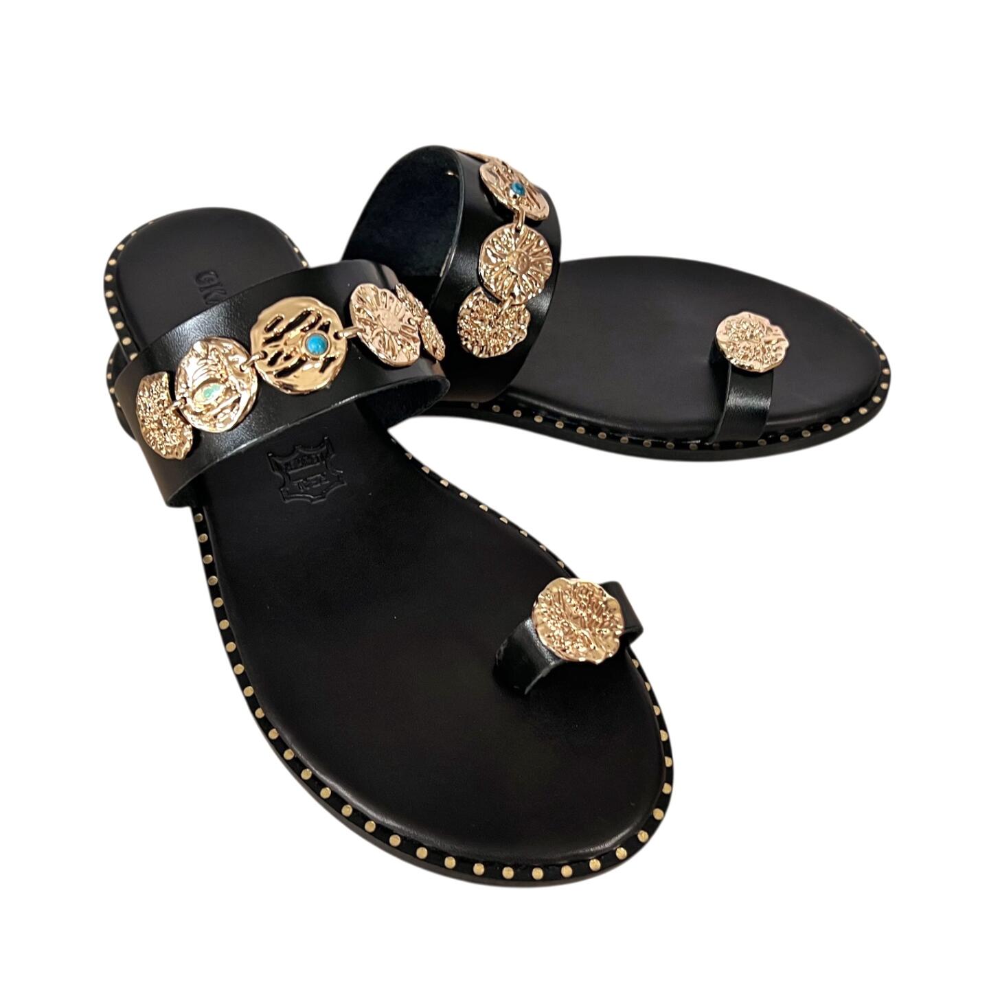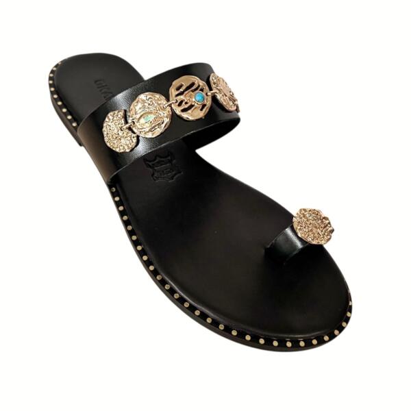 Leather anatomical sandals with gold plated tokens.