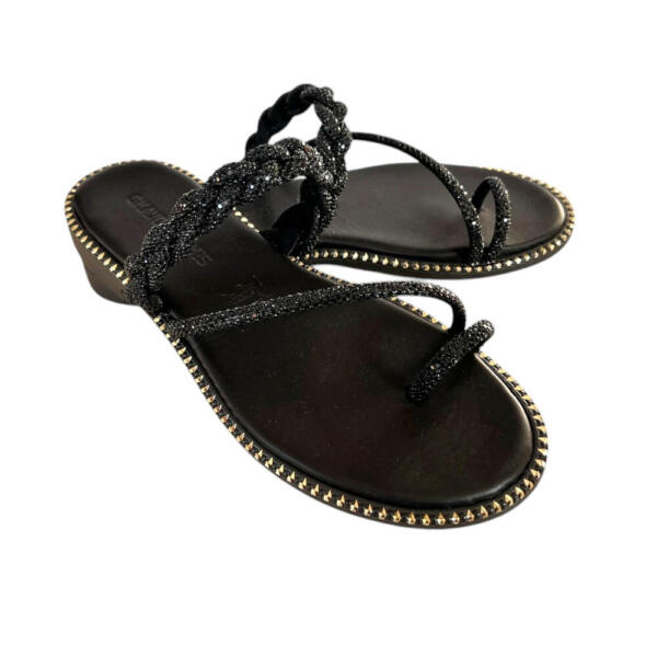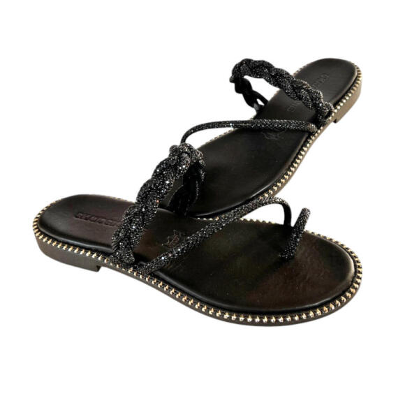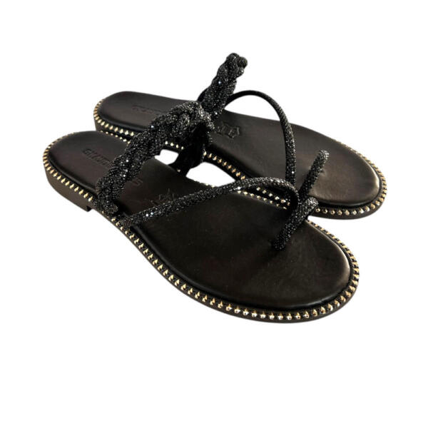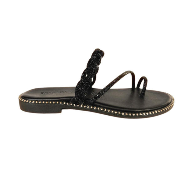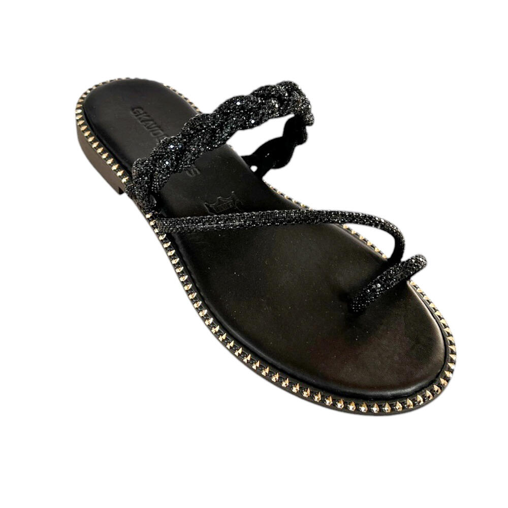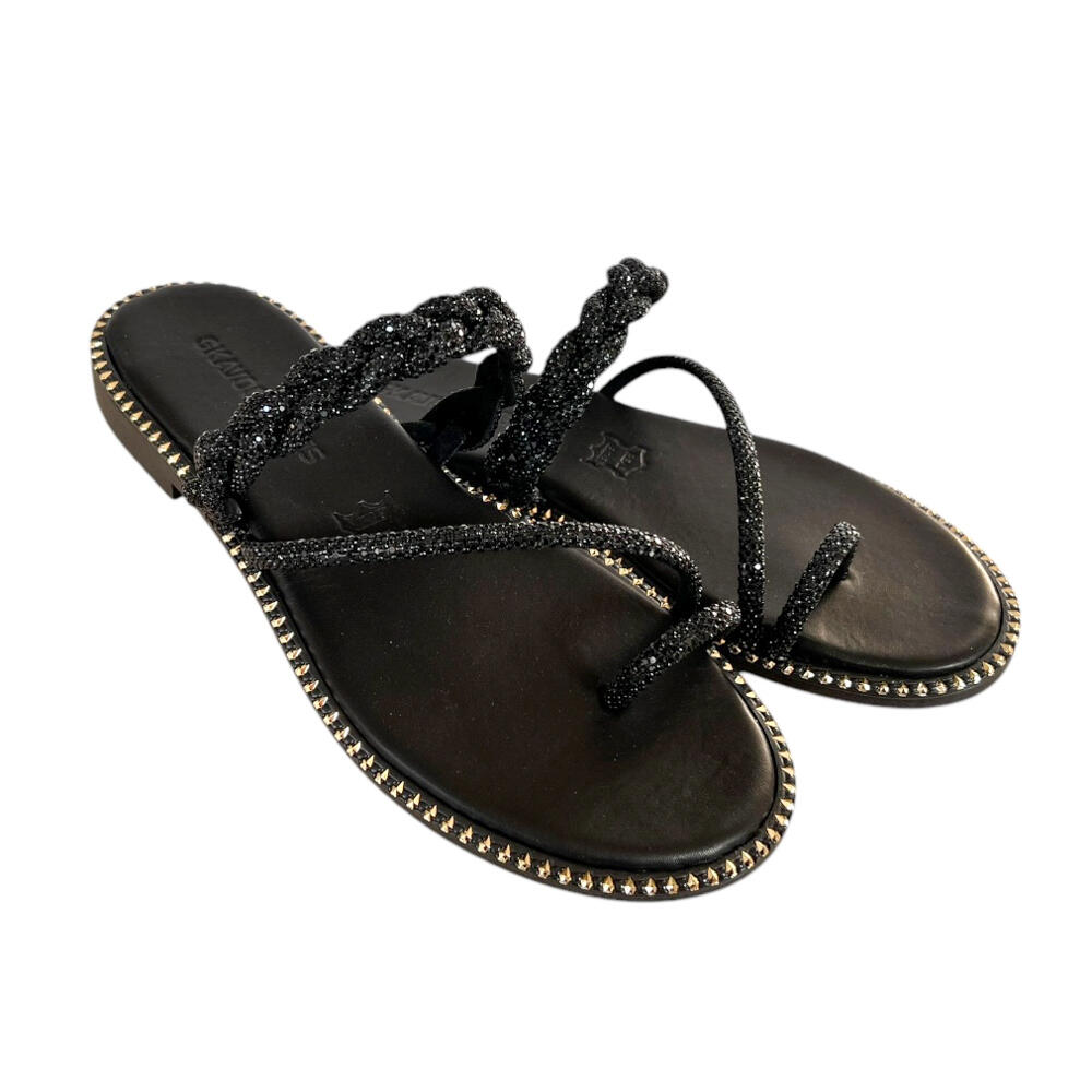 Το χειροποίητο flat δερμάτινο σανδάλι GKAVOGIANNIS με strass αποπνέει κομψότητα και διακριτική λάμψη, αποτελώντας ιδανική επιλογή για γυναίκες που θέλουν να ξεχωρίζουν με άνεση και στυλ.