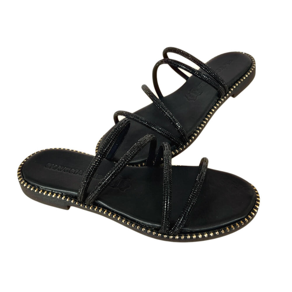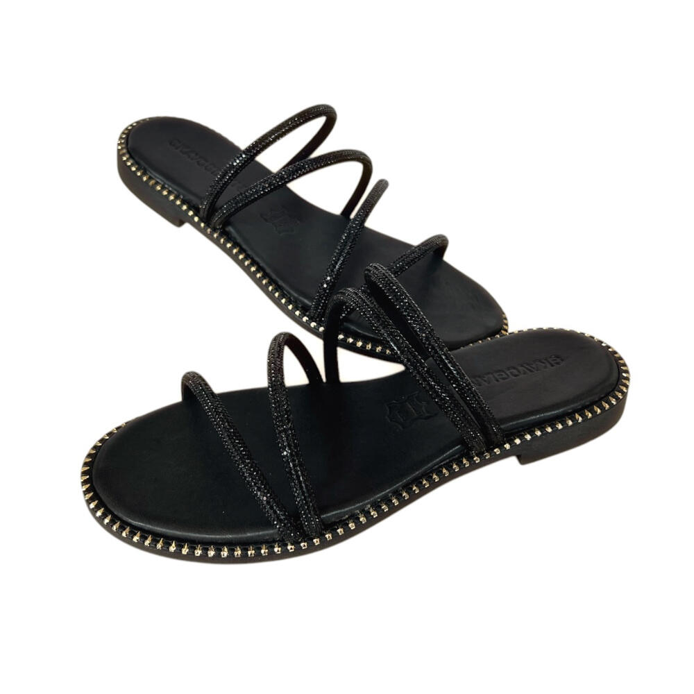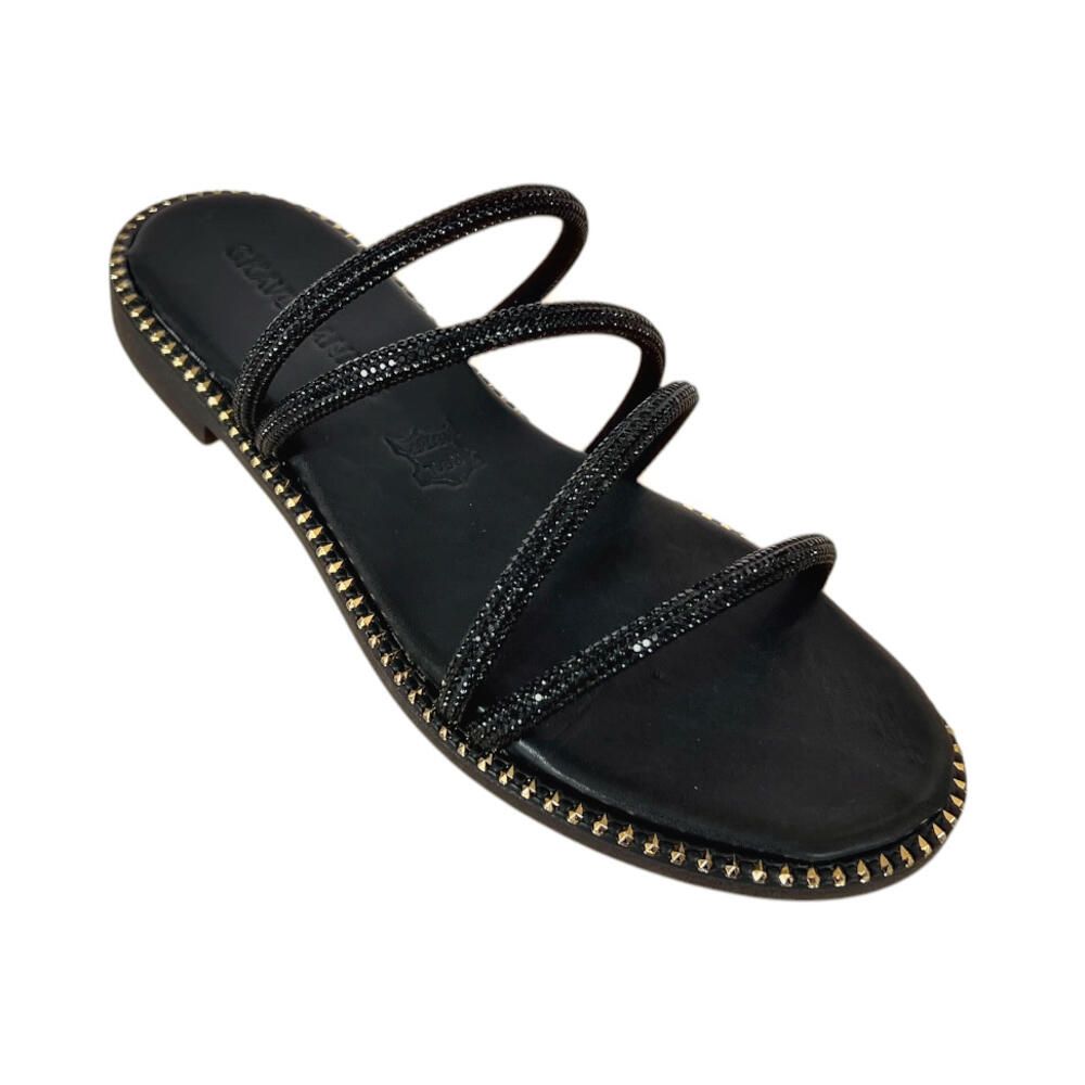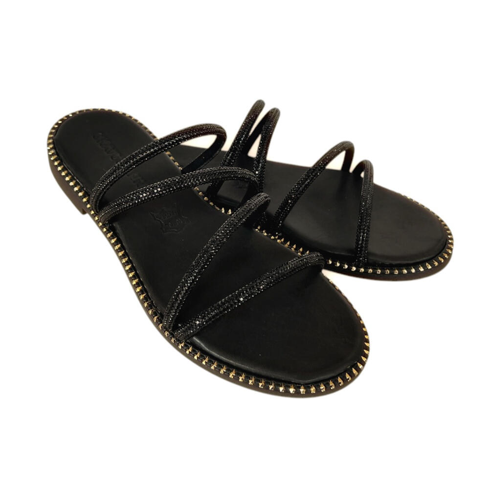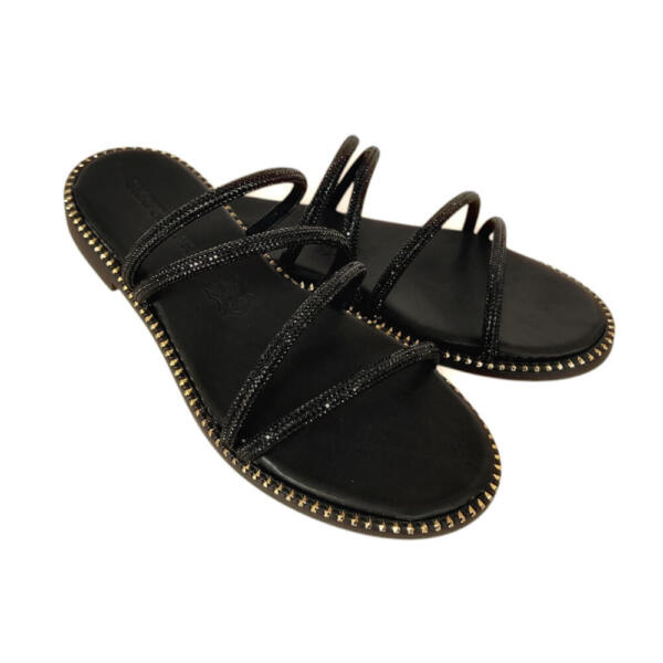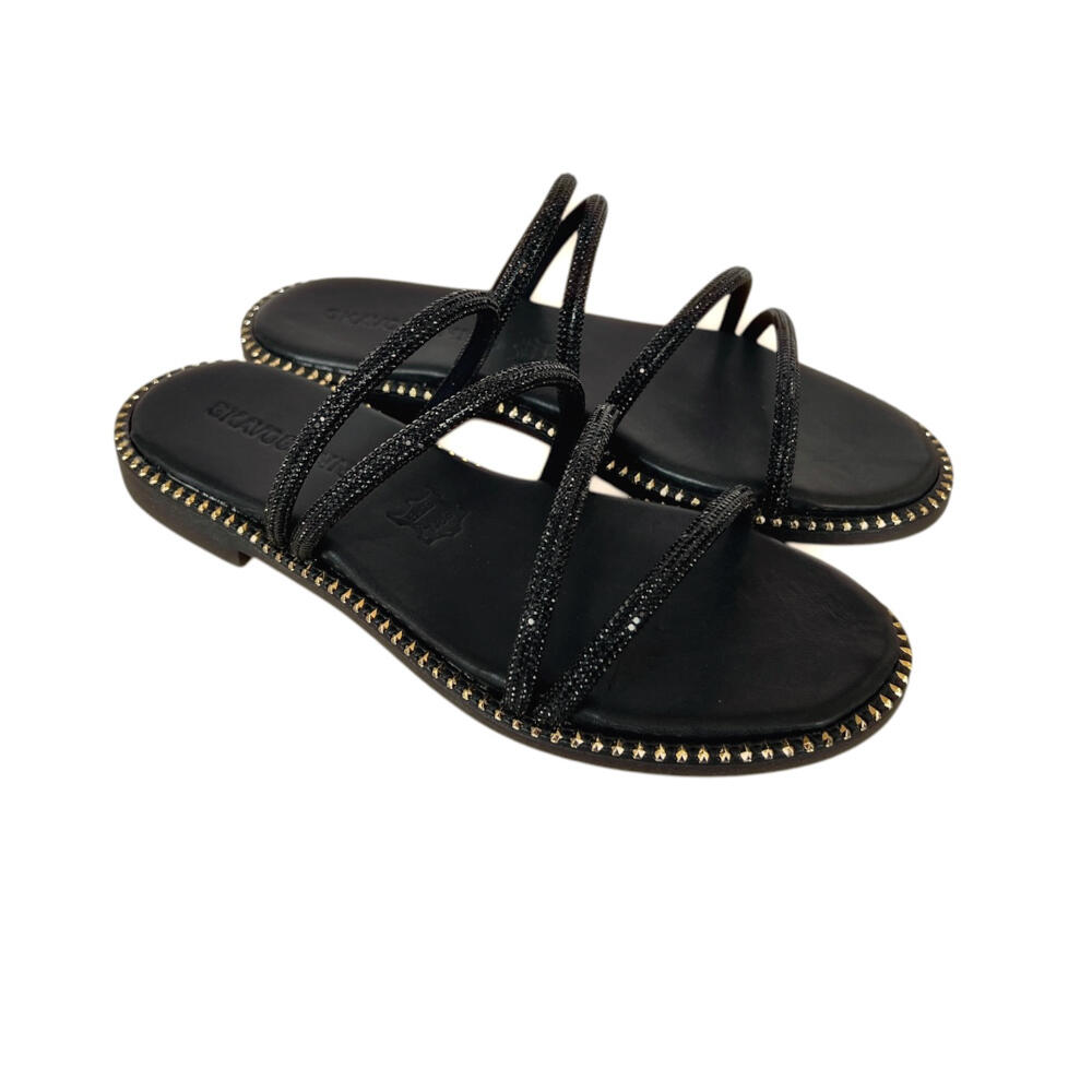 Το χειροποίητο flat δερμάτινο σανδάλι GKAVOGIANNIS με strass αποπνέει κομψότητα και διακριτική λάμψη, αποτελώντας ιδανική επιλογή για γυναίκες που θέλουν να ξεχωρίζουν με άνεση και στυλ.