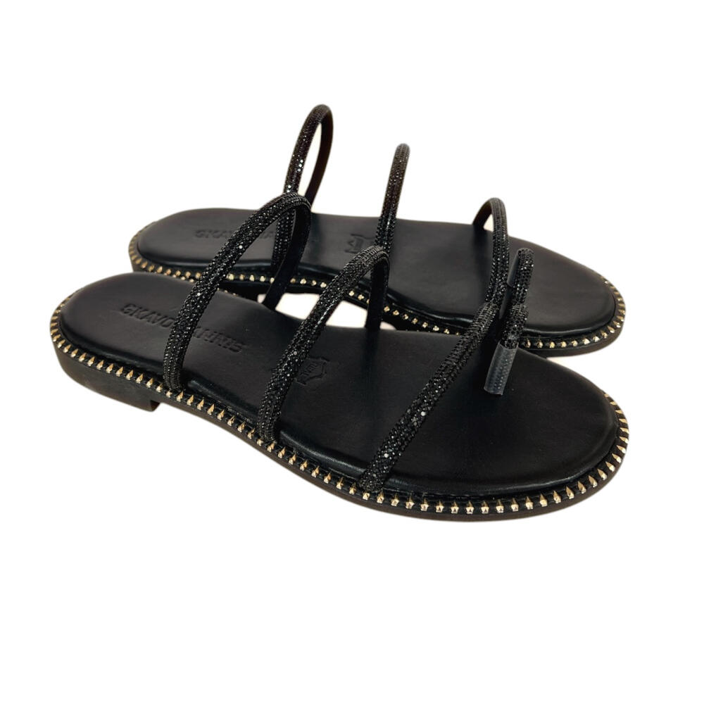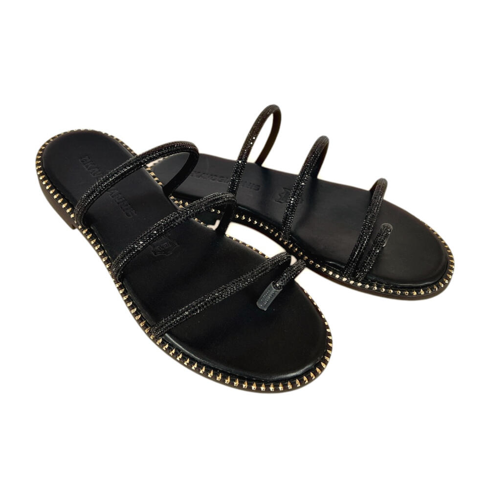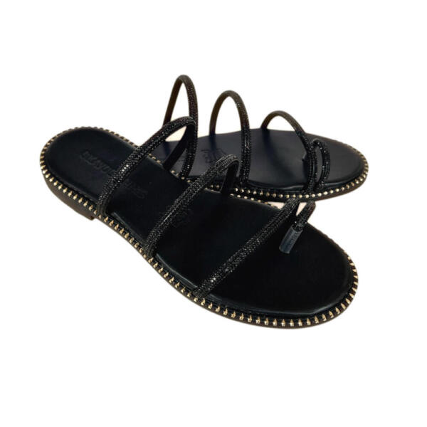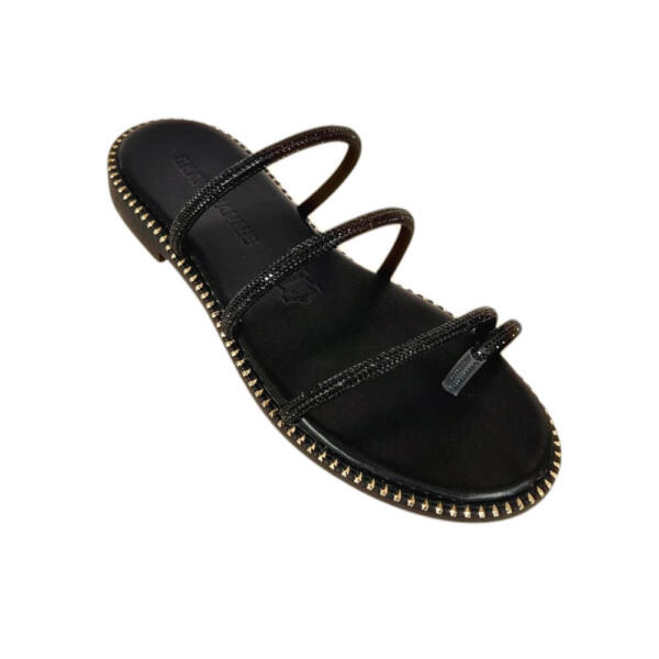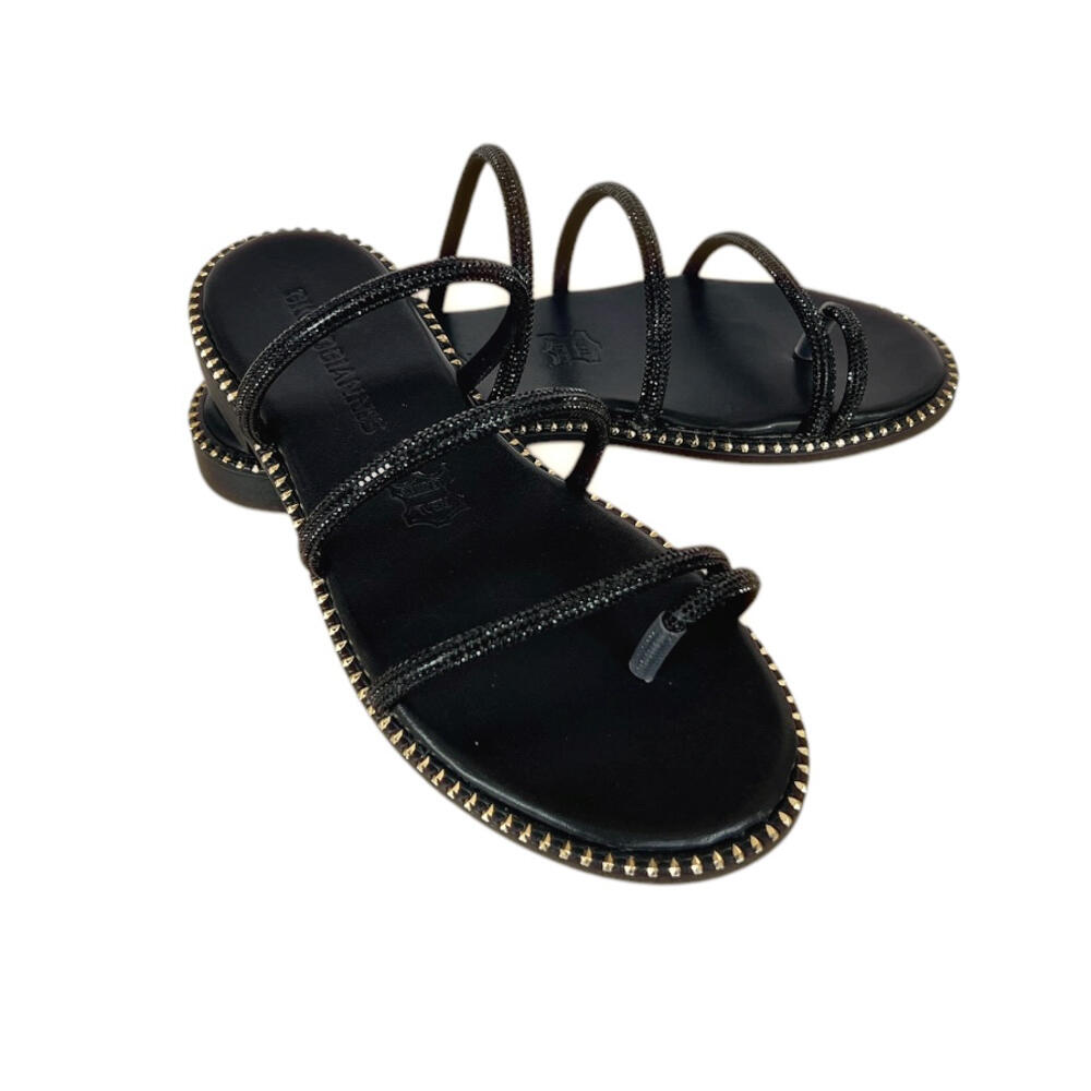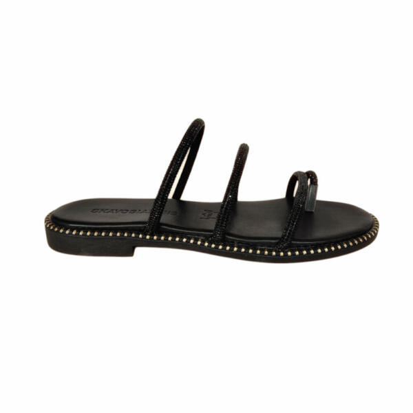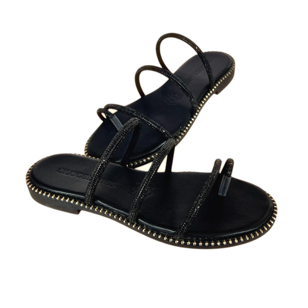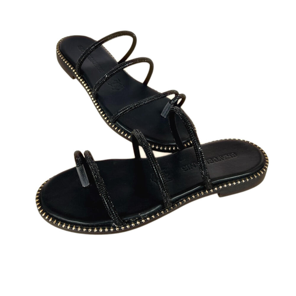 Το χειροποίητο flat δερμάτινο σανδάλι GKAVOGIANNIS με strass αποπνέει κομψότητα και διακριτική λάμψη, αποτελώντας ιδανική επιλογή για γυναίκες που θέλουν να ξεχωρίζουν με άνεση και στυλ.