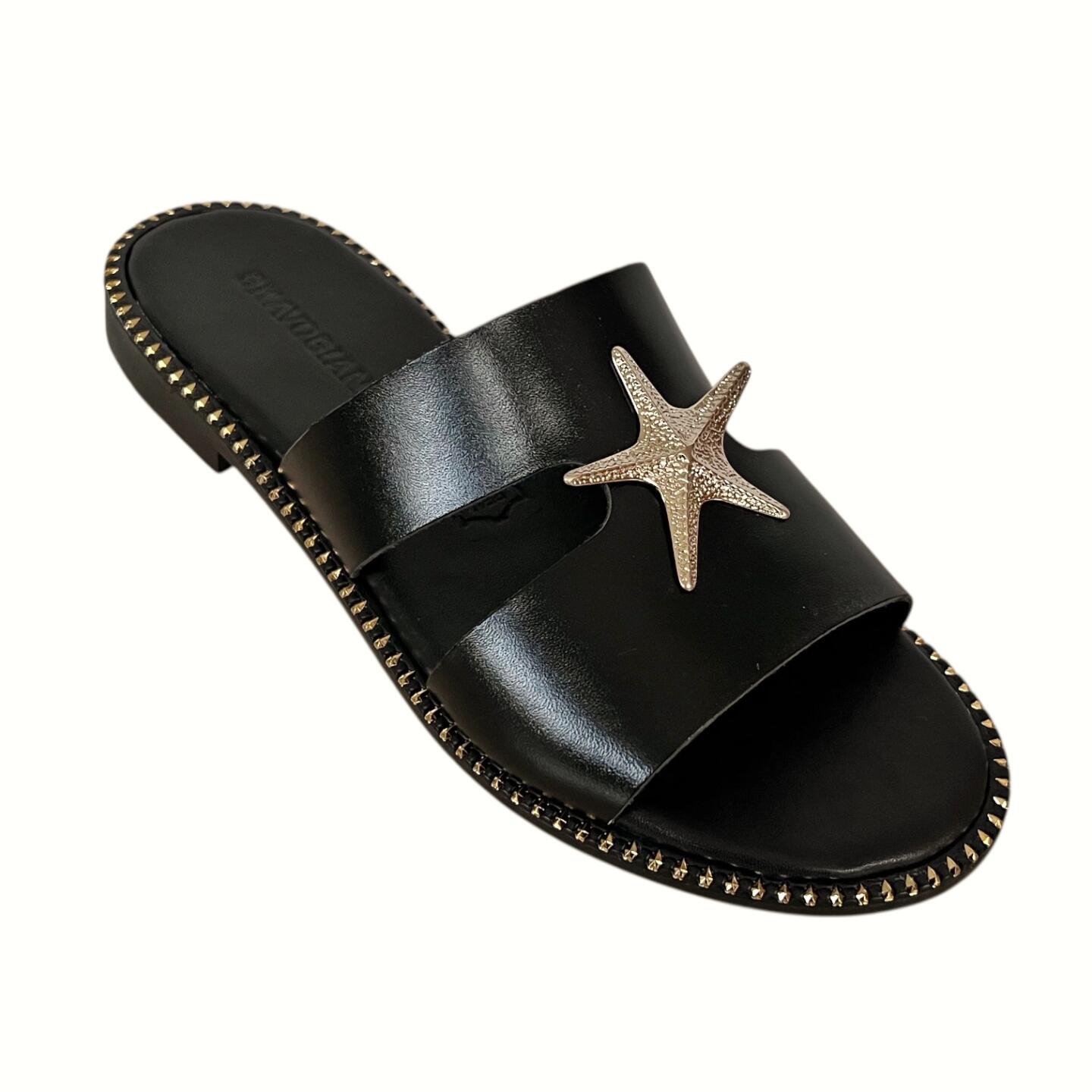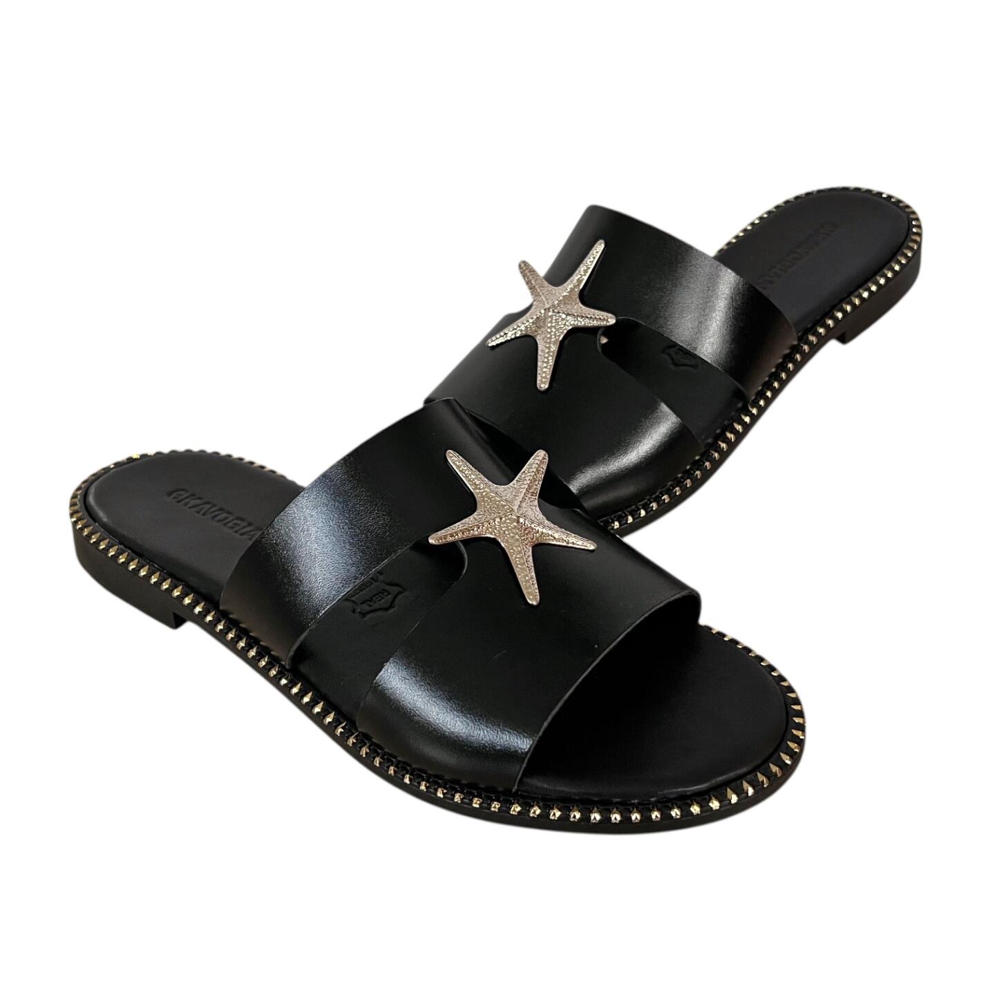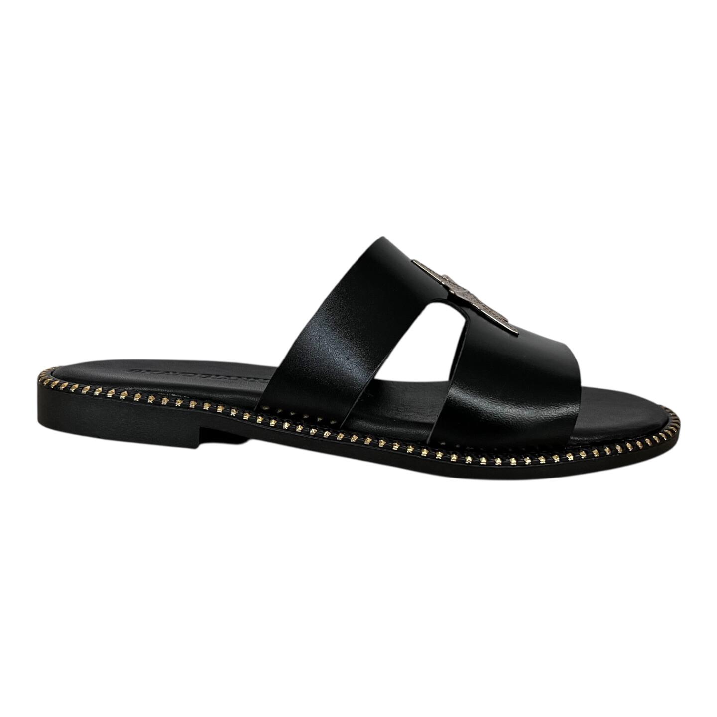 Το flat δερμάτινο σανδάλι GKAVOGIANNIS με επίχρυσα διακοσμητικά στοιχεία εκφράζει τη σύγχρονη ελληνική κομψότητα μέσα από καθαρές γραμμές και διακριτική λάμψη.
