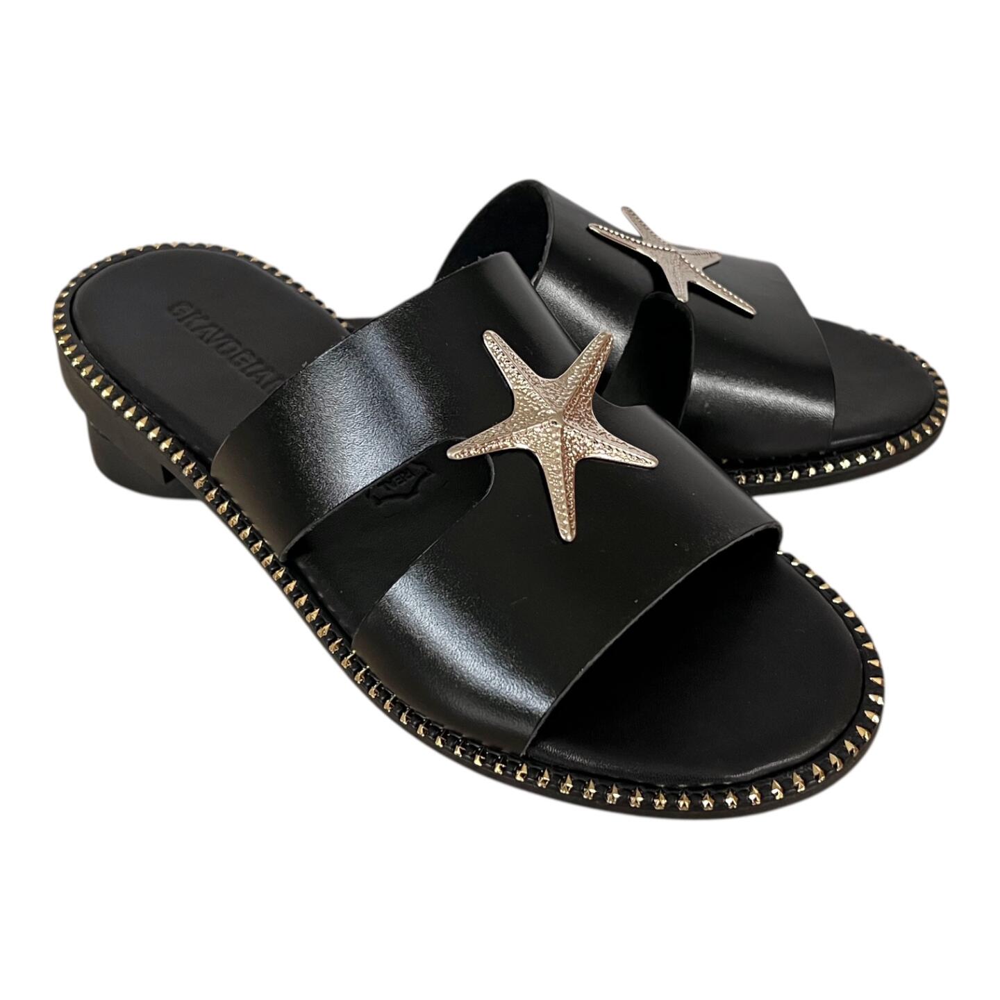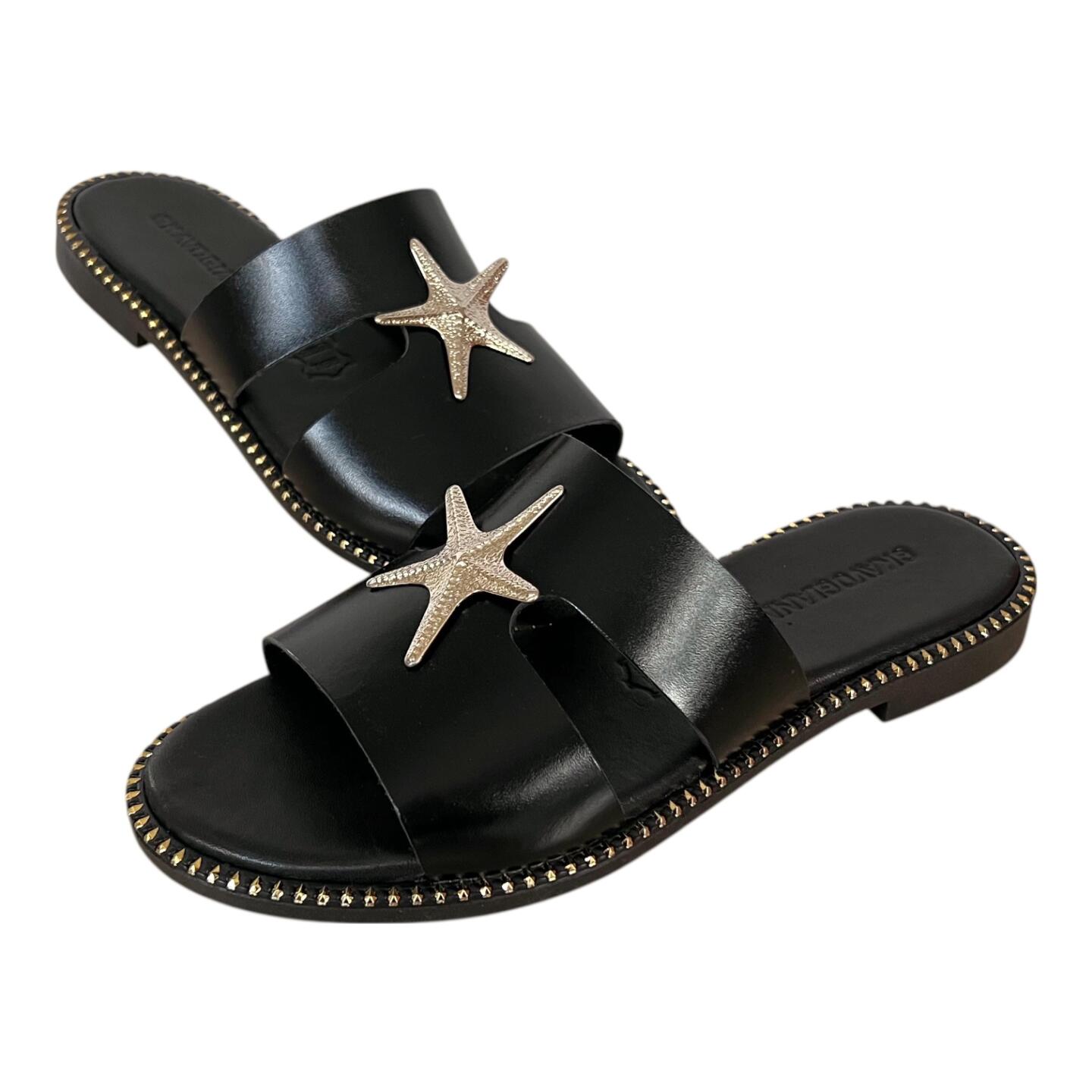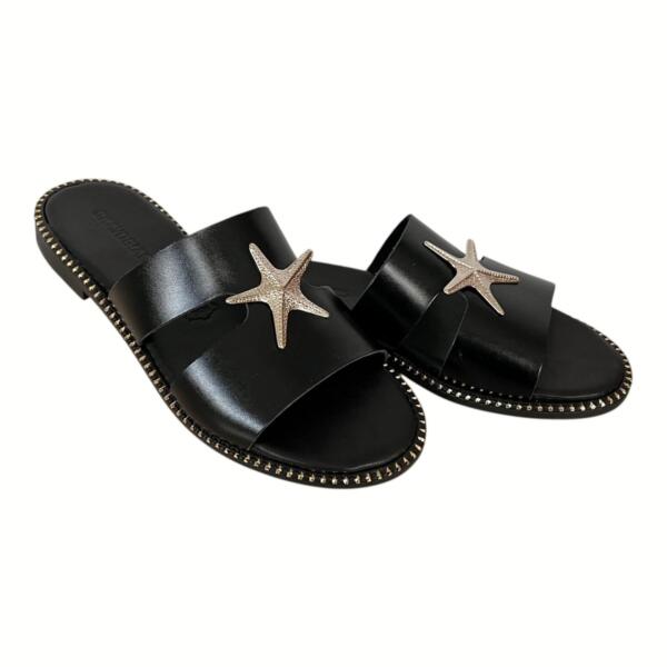 Το flat δερμάτινο σανδάλι GKAVOGIANNIS με επίχρυσα διακοσμητικά στοιχεία εκφράζει τη σύγχρονη ελληνική κομψότητα μέσα από καθαρές γραμμές και διακριτική λάμψη.