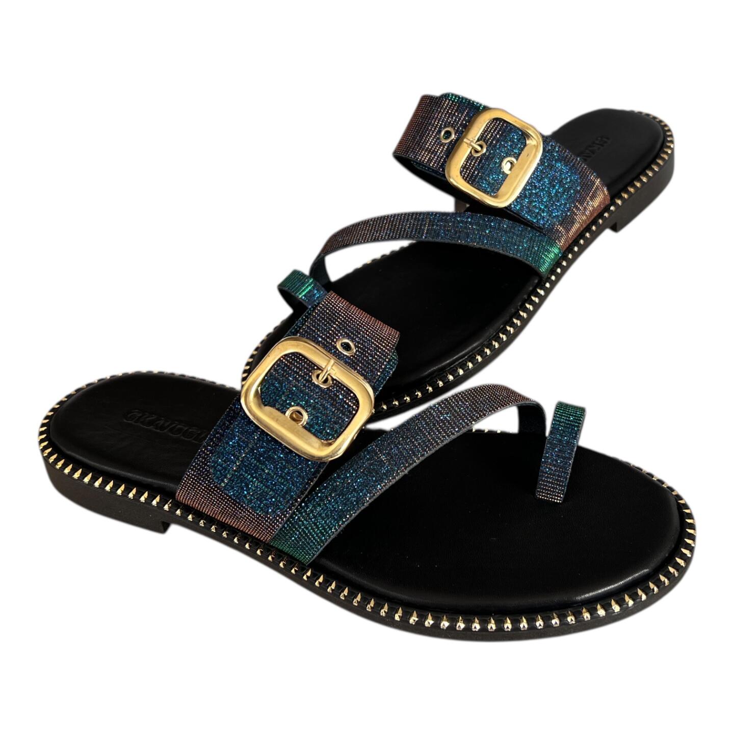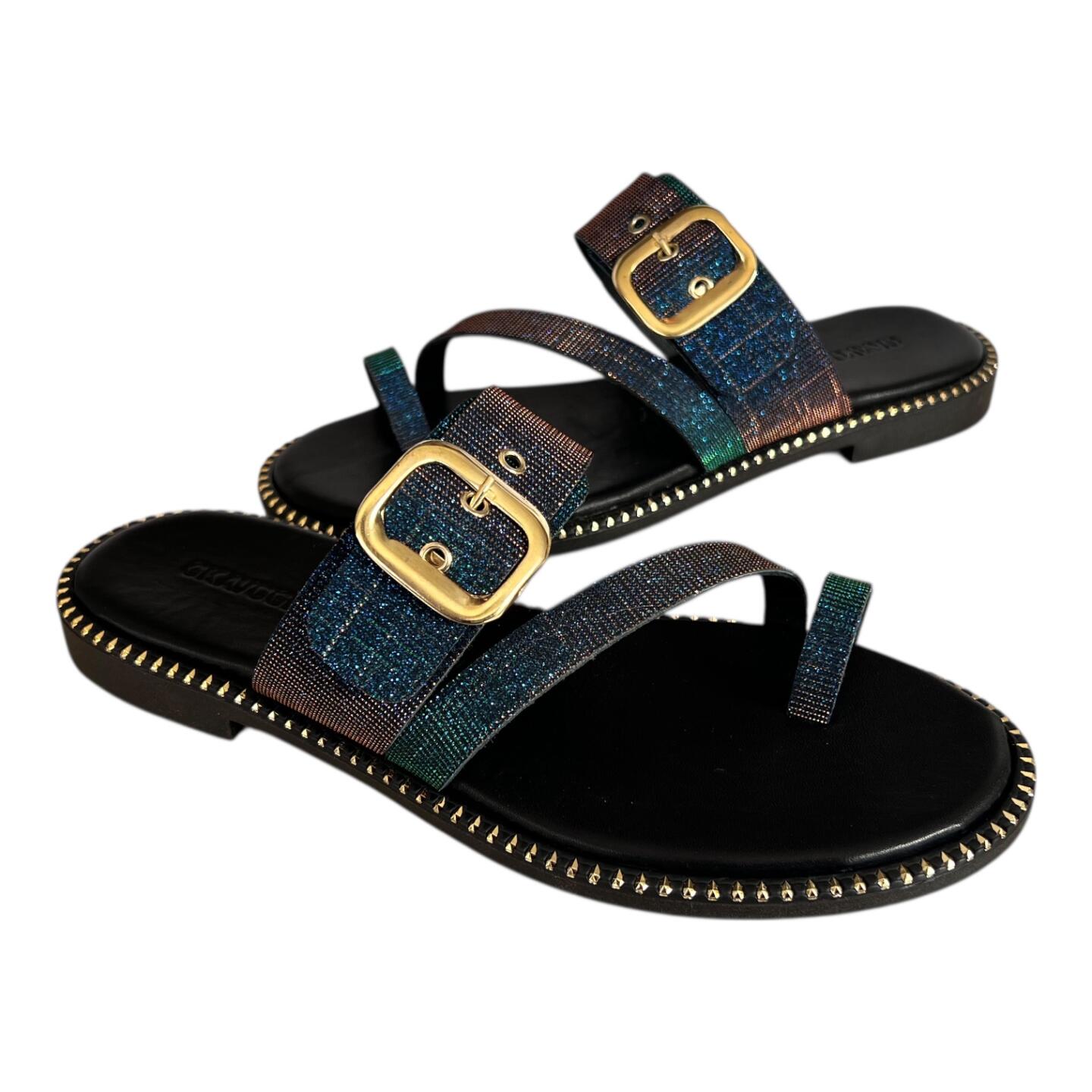 Οι φαρδιές δερμάτινες φάσες με επίχρυσους τόκες προσδίδουν ιδιαίτερο χαρακτήρα και αναβαθμίζουν αισθητικά το σανδάλι, προσφέροντας παράλληλα σταθερή εφαρμογή στο πόδι.